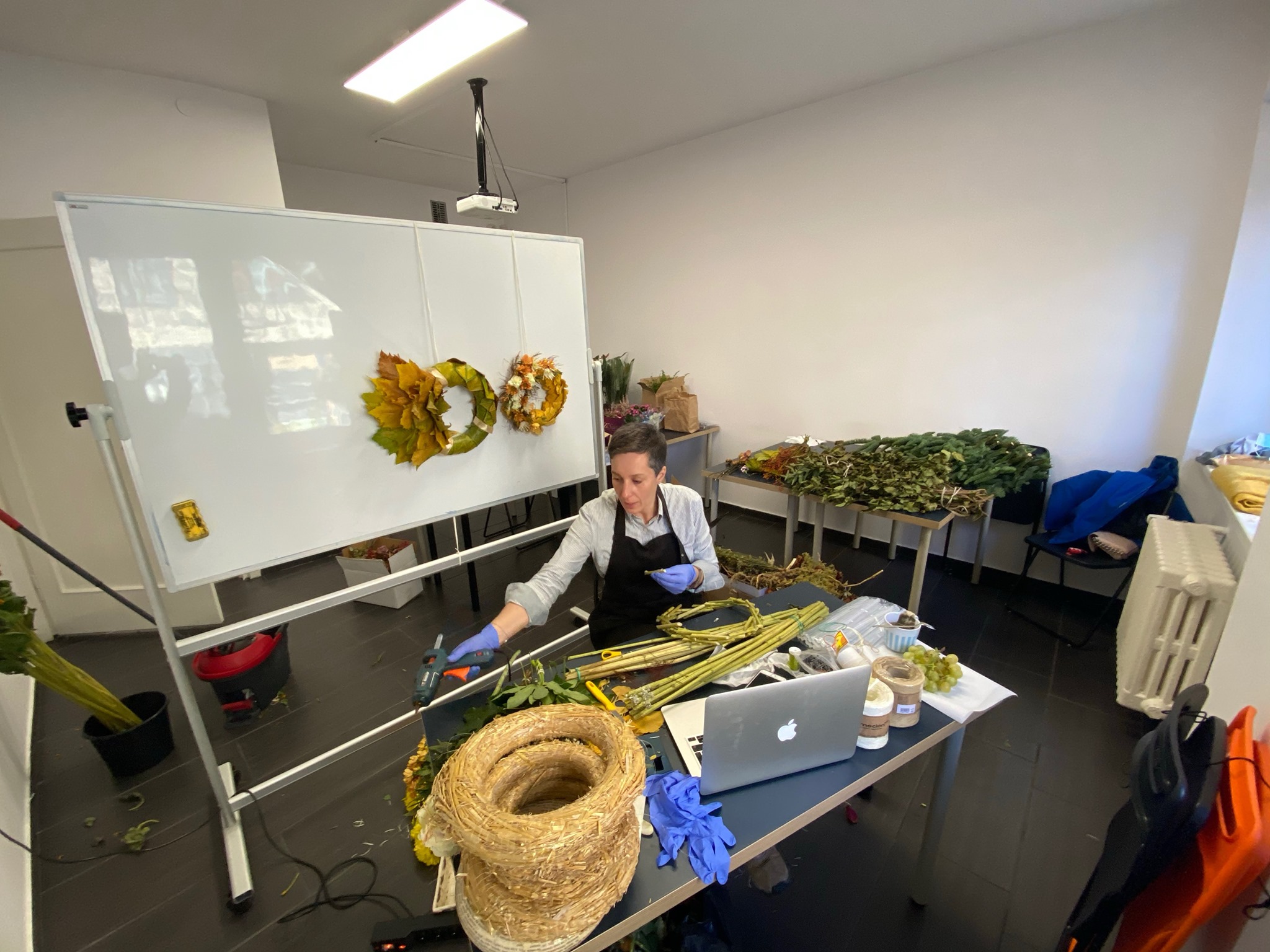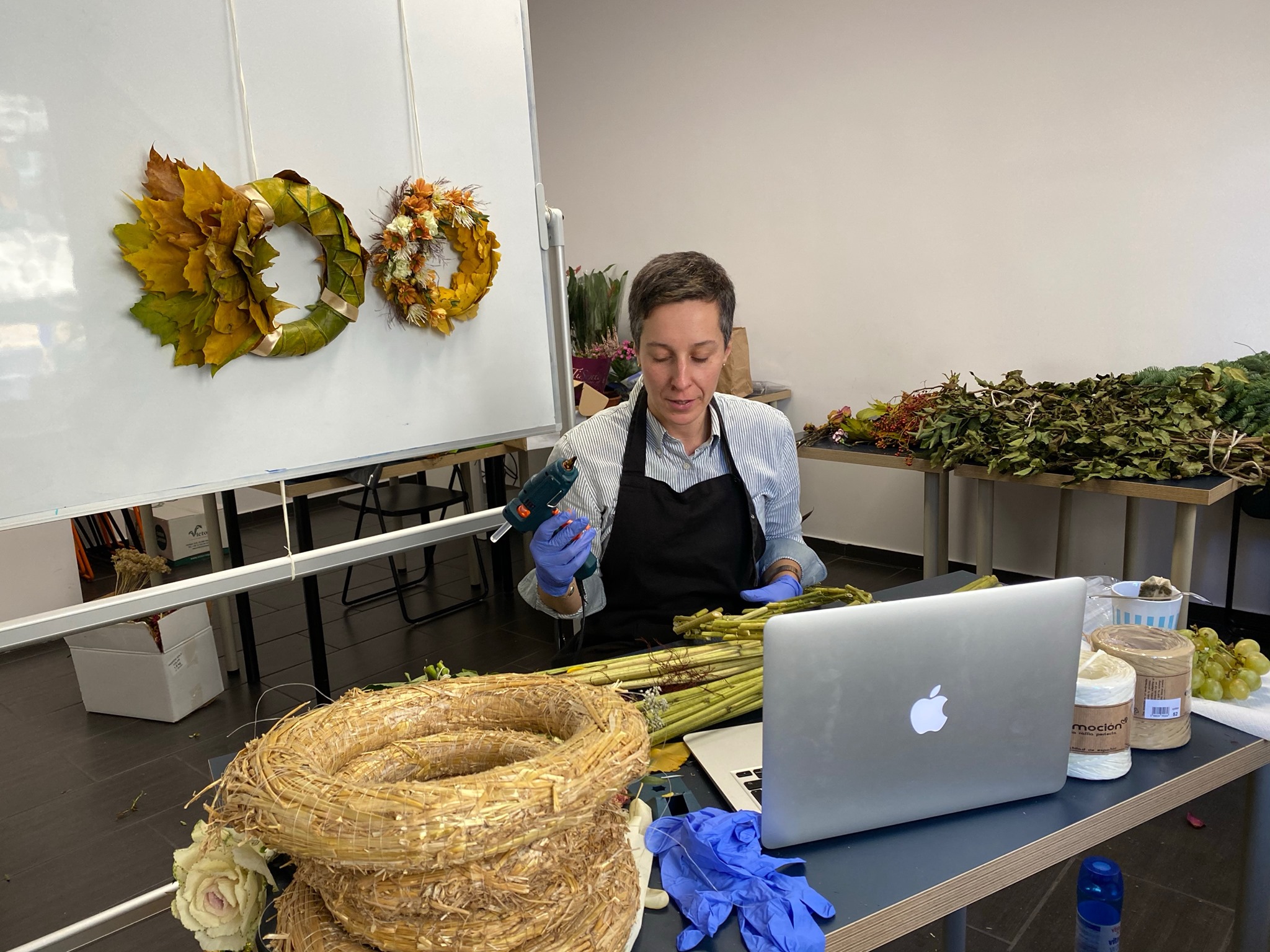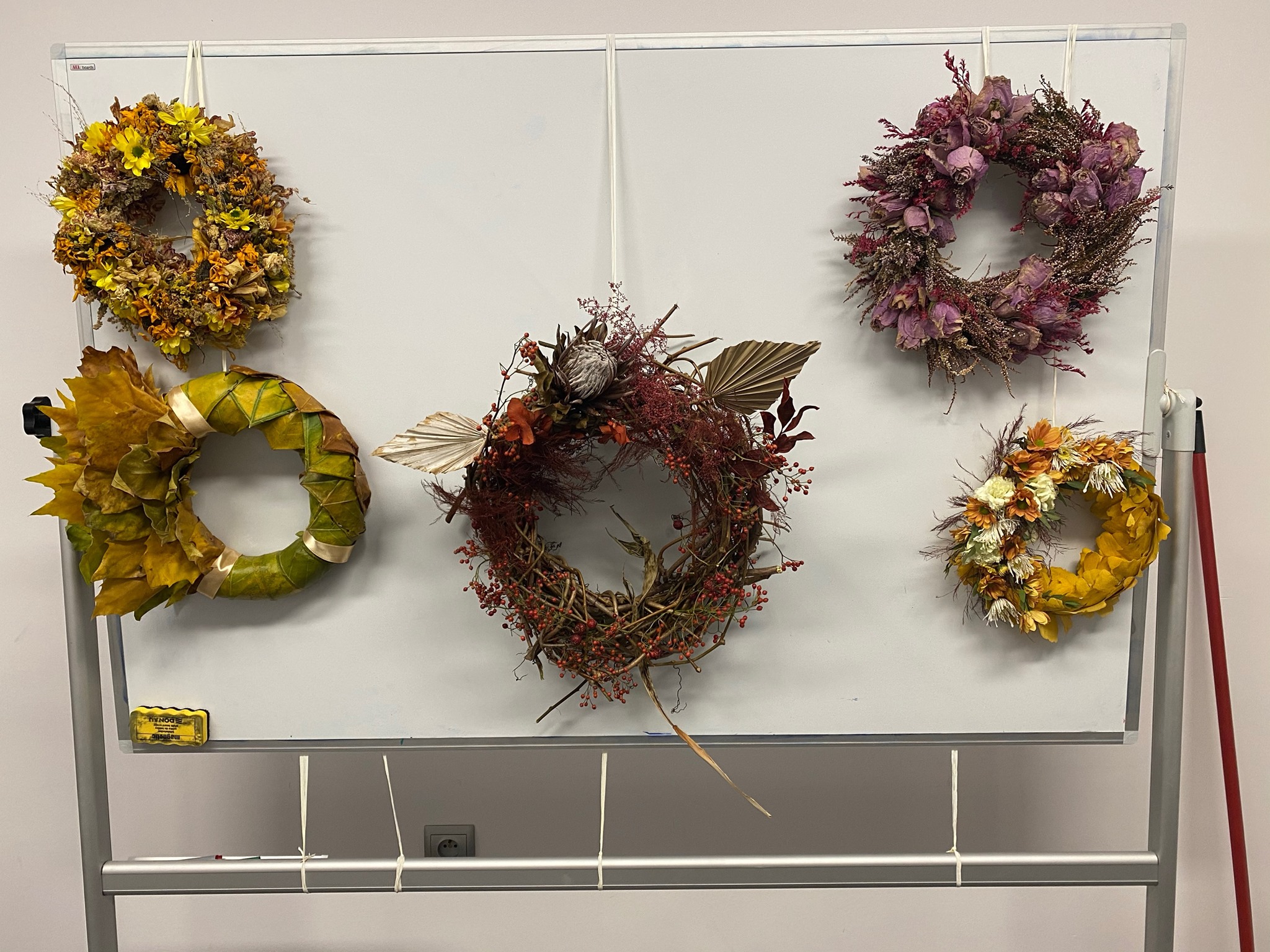 Nasi słuchacze również stanęli na wysokości zadania. Dzięki pracy zespołowej, powstały przepiękne wieńce rzymskie w różnych wariantach wykończenia. Pani Ania użyła między innymi wrzoścców, róż, zatrwianu – Goniolimon tataricum oraz suszu z wrzosów.